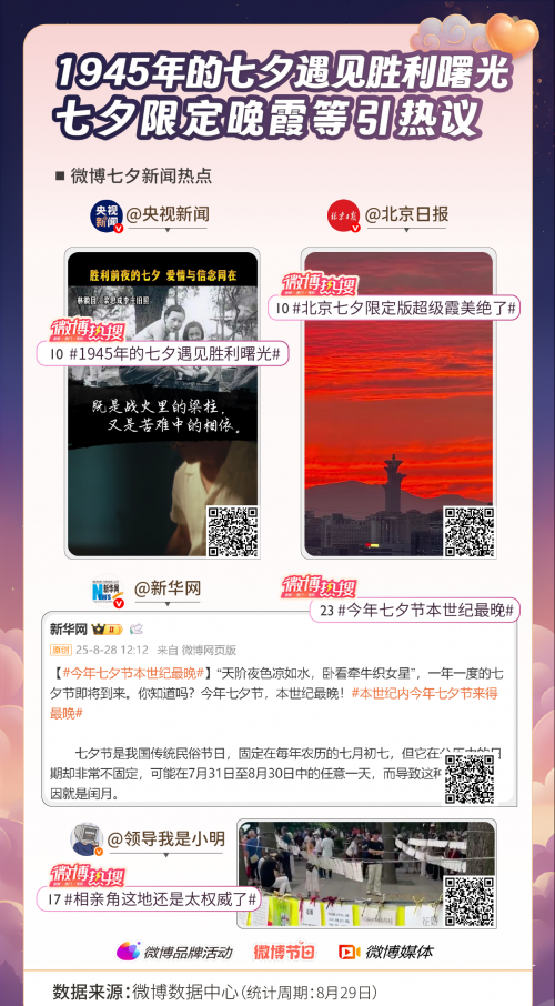 恰逢抗日战争胜利八十周年,今年七夕特别记录家国情怀与血色浪漫。@央视新闻 发布的#1945年的七夕遇见胜利曙光#话题登上热搜前十,将抗日史实与节日氛围完美融合。@北京日报 发布#北京七夕限定版超级震撼美绝了#展现首都壮美落日,获网友疯狂点赞。@新华网 顺势发起#今年七夕节本世纪最晚#话题,让网友在浪漫氛围中增长天文知识。传统节日与家国情怀、历史记忆相结合,创新表达激活千万网友情感共鸣。