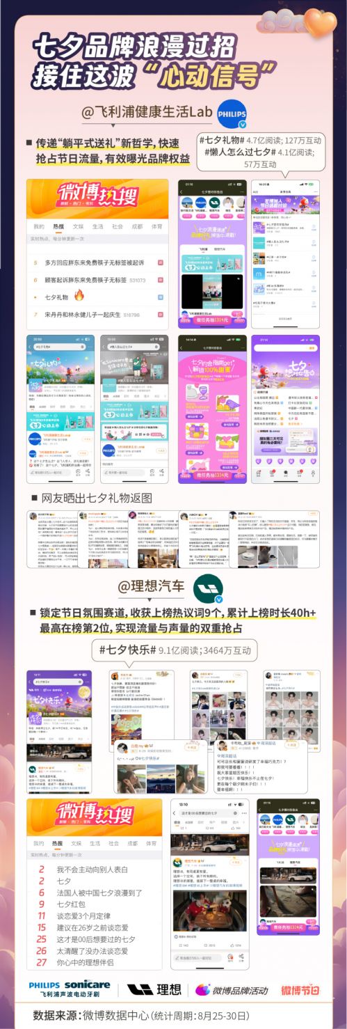 品牌借势七夕,这波“心动信号”也能接得恰到好处。报告显示,多家品牌在微博推出创意战略内容,与用户共创七夕仪式感。@飞利浦健康生活Lab合作#七夕礼物#、#懒人怎么过七夕#话题,阅读量分别达4.7亿、4.1亿,双话题合计互动量超180万。借势热搜,飞利浦品牌价值巧妙融入用户选购心智。网友们欣然晒出的飞利浦系列礼物,成为七夕动态里的动人风景。@理想汽车合作#七夕快乐#话题,阅读量突破9.1亿,3464万互动量创下品牌节日营销高峰,通过定制化内容和专属福利,收获上榜热搜议词9个,累计上榜时长40小时,最高在榜第2位,实现流量与声量的双重爆发。