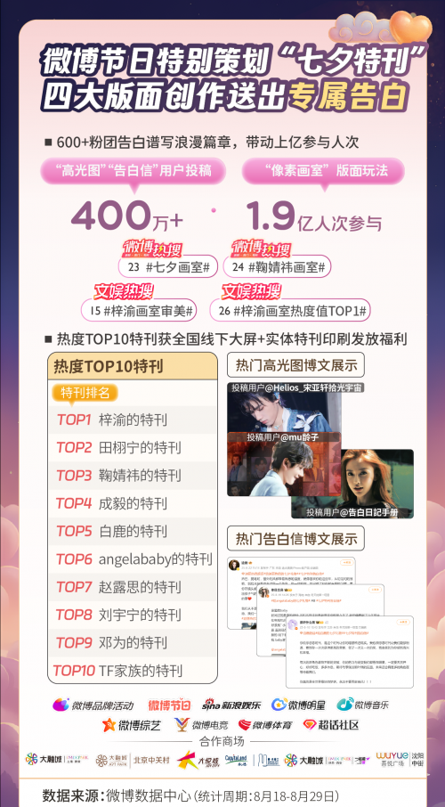 七夕活动期间,微博推出的创新玩法实现线上线下贯穿联动。报告显示,600余粉团告白内容通过“高光图”“告白信”“像素画室”等形式呈现,累计带动上亿人次参与。热度TOP10特刊榜单中,@梓渝、@田栩宁、@鞠婧祎 的特刊分列前三,#鞠婧祎画室#、#梓渝画室审美#等话题借势登榜热搜。TOP10特刊将同时斩获全国六大商圈大屏与实体特刊印刷发放福利,为数字化的爱意赋予可触摸的温度。