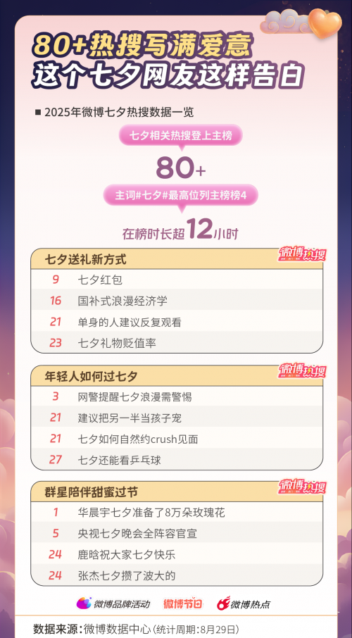 2025年微博七夕期间,相关热搜登上主榜80+条,主词#七夕#最高位列主榜第4位,在榜时长超12小时,展现强劲的话题生命力。其中,#七夕红包#、#国补式浪漫经济学#、#七夕礼物贬值率#等话题上榜,折射理性过节的送礼新观念。明星陪伴也是节日新亮点,#华晨宇七夕准备了8万朵玫瑰花#登顶热搜榜单,#央视七夕晚会全阵容官宣#、#鹿晗祝大家七夕快乐#、#张杰七夕攒了波大的#也顺势入榜。群星齐聚,点燃节日浪漫氛围。