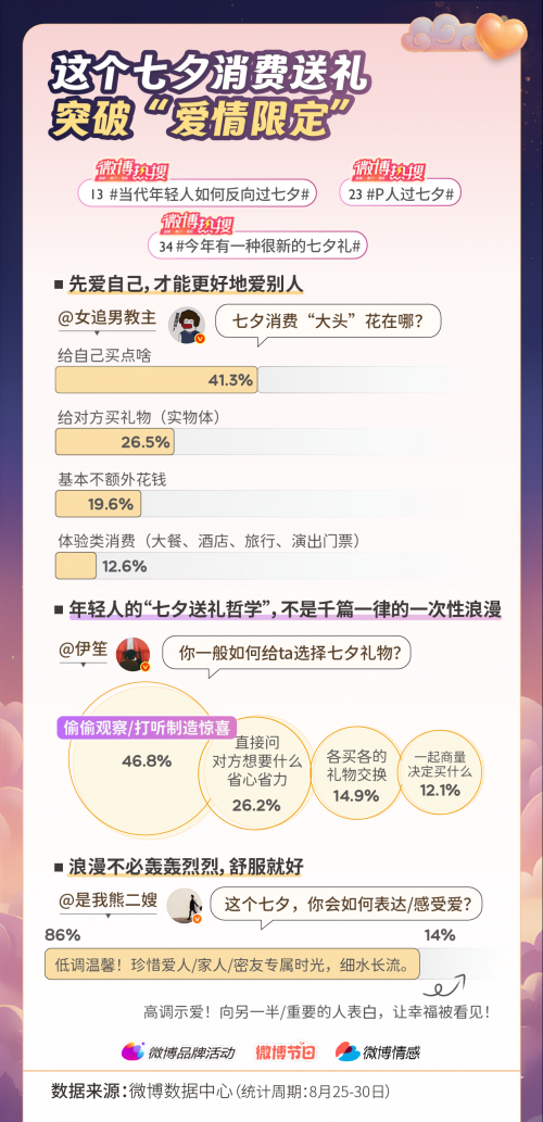 微博调研数据,还进一步勾勒出当代年轻人独特的“七夕送礼哲学”。报告显示,今年七夕消费,“先爱自己,才能更好地爱别人”成为恋爱消费主导理念。@女追男教主 发起调查发现,超四成受访者优先选择“给自己买点啥”,远超给对方买礼物的近三成。在@伊笙 的调查中,如果要给对方送礼,近半数受访者偏爱“偷偷观察制造惊喜”。情感表达方面,@是我熊二嫂 的调查显示,86%用户期望“低调温馨,细水长流”的过节模式,高调示爱者并不为多数。可见,浪漫不必轰轰烈烈,舒适自然的表达方式更受人群青睐。