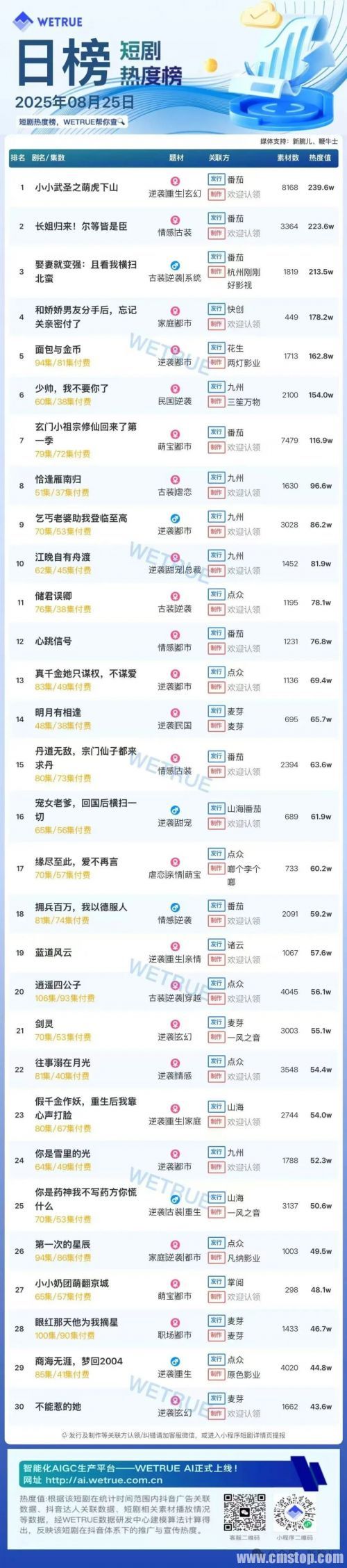 8月25日付费短剧大盘4866万:《小小武圣之萌虎下山》第一 2025-09-18 08:55 来源:新腕儿 字号: 今天发布的是昨天(8月25日)短剧付费大盘日榜,整体大盘热度值为4866万。 相关说明: 1、本日榜为WETRUE短剧数据公司提供,新腕儿和鞭牛士提供联合支持。 2、热度的概念见上述图注,不代表真实消耗充值金额,仅供参考。 关键词: 短剧 大盘 武圣之 第一 扫一扫关注“电影界”微信公众平台 扫一扫进入移动端浏览 您可能感兴趣的文章 破圈背后:一部短剧何以吸引了千万粉丝博主们零片酬 网易羚羊接连打造热门短剧 单剧盈利率高达1500% 踢球没出路?前中超门将王年将成转型拍短剧 饶雪漫进驻短剧赛道:创作者应摸准爱情电影时代脉搏 从IP衍生到生意增长,快手短剧联手京东外卖给出情绪 看完这部让人疯狂上头的短剧,我默默打开了京东外卖 抖音、小红书、微信、拼多多后,支付宝也躬身入局短 饶雪漫进驻短剧赛道:创作者应摸准爱情电影时代脉搏