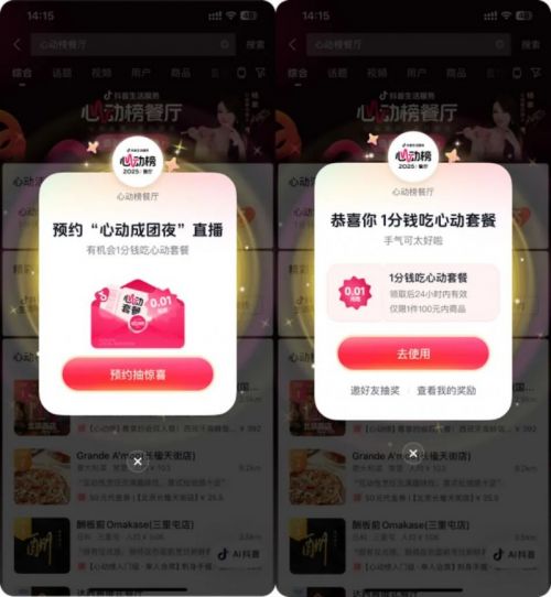 除了这些互动任务,关注“心动成团夜”直播也有福利。即日起至9月23日,上抖音搜索“心动榜餐厅”关键词,即可触发彩蛋↓