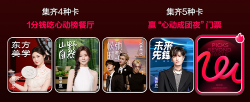 用户还能通过完成互动任务收集卡片,集齐4种卡后,可以有抽奖领取1分钱吃心动榜餐厅的机会;集齐5种卡,就可能赢得“心动成团夜”门票。另外,晒出自己在餐厅的用餐氛围体验也能获得抽卡机会,兑换礼品。