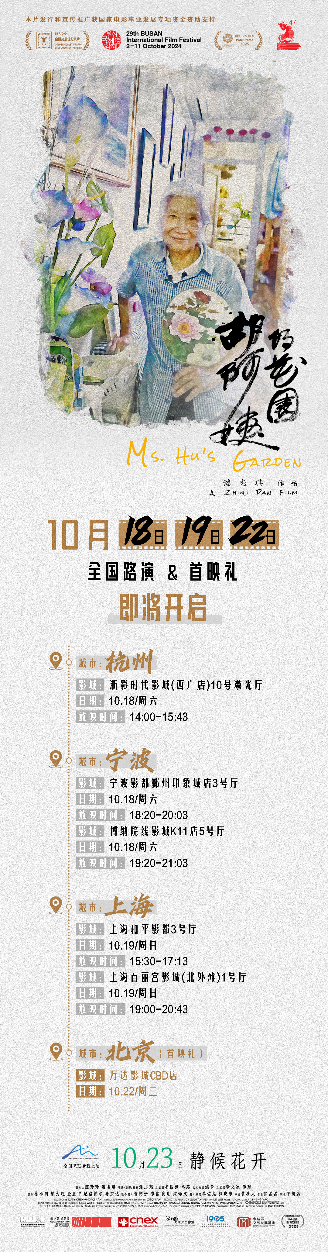 1905电影网讯 在各大国际影展获奖无数的纪录电影《胡阿姨的花园》提前观影来了!《胡阿姨的花园》将于10月18日至19日在杭州、宁波、上海三地举行五场提前点映。届时,观众不仅能抢先欣赏影片,还能在映后与主创团队面对面交流,深入了解影片幕后故事。本次活动特别准备了惊喜福利,诚邀广大影迷朋友提前购票锁定席位,共同走进“胡阿姨的花园”,感受光影与真情的交织。
