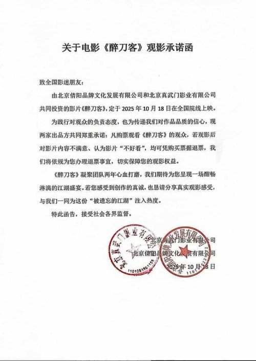 当武侠片深陷特效堆砌的“悬浮陷阱”,一部敢于以“真功夫”直面市场、并以“退票承诺”保障品质的作品,携着江湖热血而来——10月18日,由北京真武门影业有限公司与北京倩阳品牌文化发展有限公司联合出品的武侠力作《醉刀客》正式登陆全国院线。影片以“去虚向实”的创作态度为疲软的武侠类型片注入强心剂,更凭借“观影不满意可退票”的颠覆性承诺,引发行业与观众的双重关注。同时,影片在宣发中强调“真功夫”与“侠义精神”的融合,为武侠电影的复兴开辟了新路径。