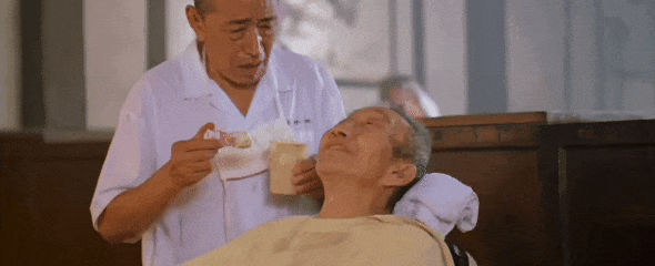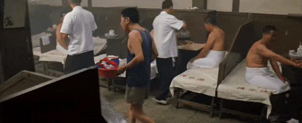 而二十年后,《沐浴之王》则以更轻松活泼的方式,展现了现代的澡堂文化。影片中,乔杉饰演的搓澡工周东海用各种“土法”训练彭昱畅饰演的富二代肖翔如何搓澡:拎水桶练臂力、搓玉米学手感、削土豆掌握力道,甚至揉面团来模拟揉背技巧。这些看似滑稽的训练方法,实则蕴含着搓澡技艺的深厚底蕴。