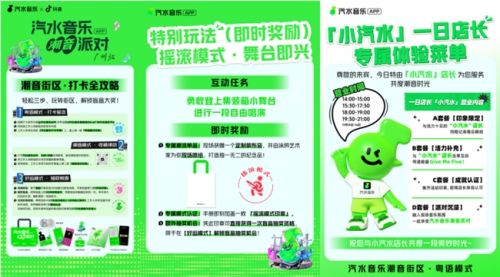 来【粤语模式】走进充满广式风情的专属角落,打卡留念,收集你的「粤语模式印章」;从【潮音模式】潜入音浪澎湃的舞台中央,感受律动,解锁酷炫的「潮音派对印章」;【好运模式】开启,集齐两枚印章后,即可在此核验,获得你的「好运印章」!选一句触动你的经典歌词,再抽取一张神秘刮刮卡,前往礼品兑换处刮开专属惊喜。兑换成功,即刻加冕终极成就——「汽水潮音大玩家」印章!还有Plus版特别玩法【摇滚模式】,直接来小舞台即兴唱演,可以获得即时奖励:定制帆布包、打卡印章、惊喜盲盒……唱出来,就直接带走!速带你的汽水音乐打卡手册,前往集结所有印章,解锁全场奖励!