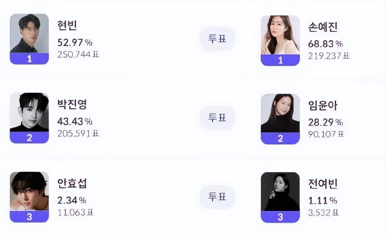 玄彬在投票中击败了朴珍荣,而孙艺珍是击败了林允儿,优势非常明显,多出林允儿很多票,而玄彬和朴珍荣几乎囊括了大家的投票。