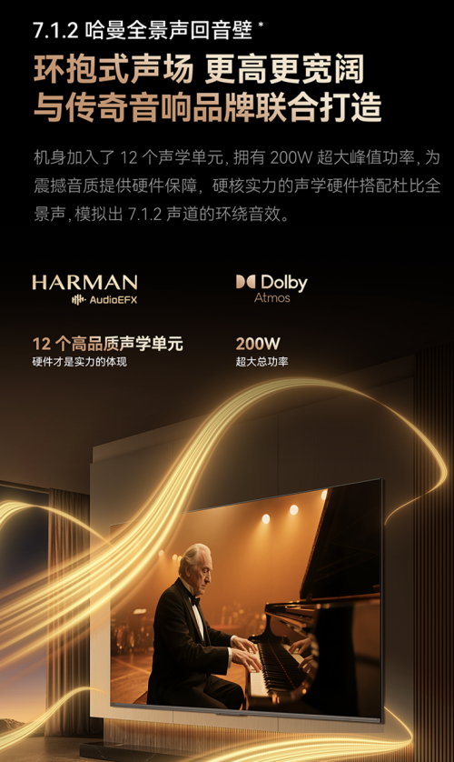 除了顶尖画质外,创维A6F Pro+在音质方面也搭载了哈曼7.1.2全景声回音壁声学系统,12个声学单元+200W超大峰值功率,为震撼的音效提供了卓越的硬件保障,真正实现“声画一体”的全方位影院级视听享受。