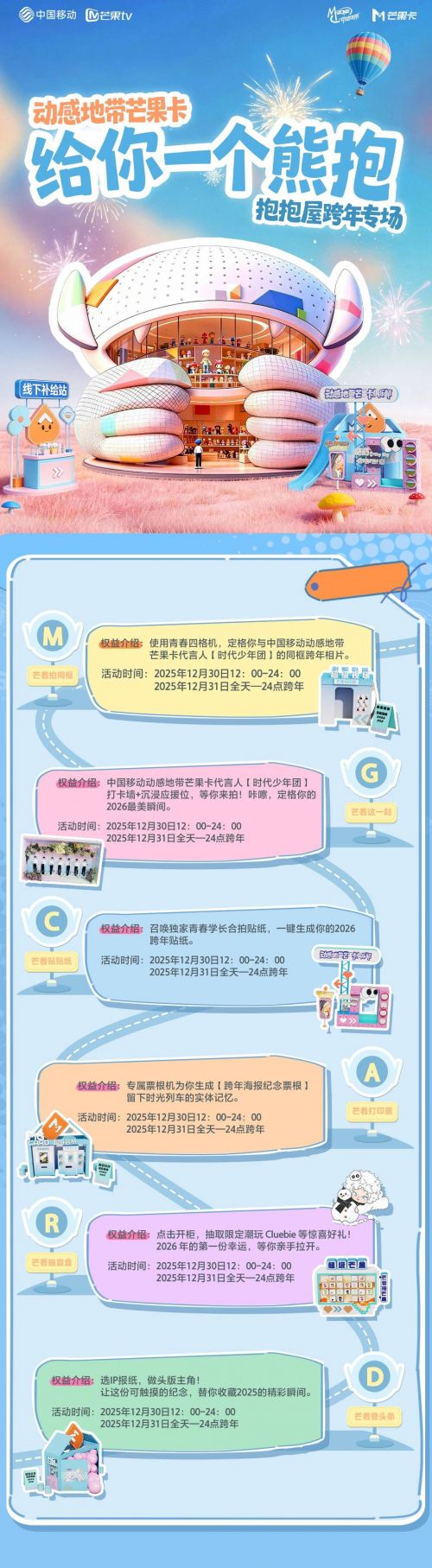 跨年不将就,快乐要“抱”紧!12月30——31日,动感地带芒果卡「抱抱屋」等你来打卡!海口站只是「抱抱屋」的起点,期待未来动感地带芒果卡带着Cluebie、芒系IP和艺人周边,解锁更多城市,带来更多惊喜与好礼!这个跨年,我们不见不散!