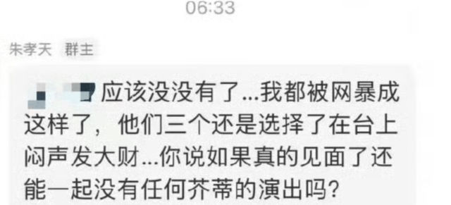 然而,在12月24日和粉丝的对话记录里,朱孝天又推翻了自己的说法,笃定此后难再合体,因为他深陷话题风暴,其他三人却在台上闷声发财,这是他不能接受的,以后见面也会心存芥蒂。