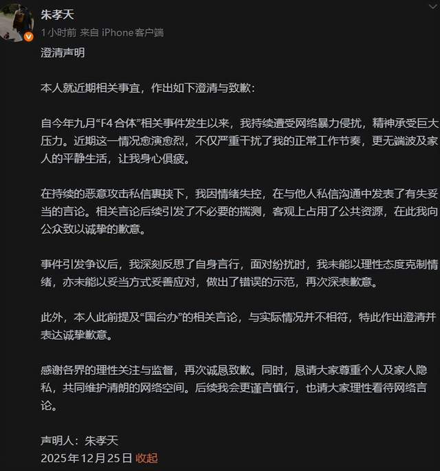 朱孝天道歉了!继连环指责五月天所属公司涉嫌违规操作、演唱会涉嫌假唱、F3弃他于不顾之后,12月25日深夜,朱孝天透过个人社交平台发布澄清声明。敲黑板划重点:1.自F4合体的相关