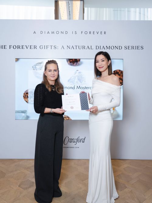 戴比尔斯钻石研究机构钻石教育总监Jodine Bolden(左)为演员佘诗曼(右)颁发天然钻石工坊证书