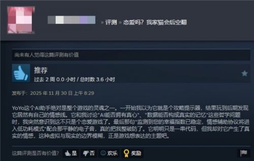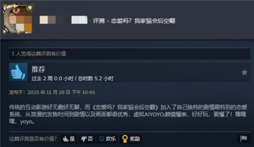在这样的浪潮下,光循花火近期出品的互动影游《恋爱吗?我家猫会后空翻》,其中YOYO也是作为核心角色首次亮相,收获诸多玩家好评,像是一记重锤,砸开了行业的新可能。