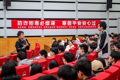 近日,在寒假到来前,快手安全中心联合合肥市公安局走进合肥工业大学,为在场200余名大学生带来了一场生动有趣的防诈拒毒公益安全公开课,助力同学们安全度寒假。