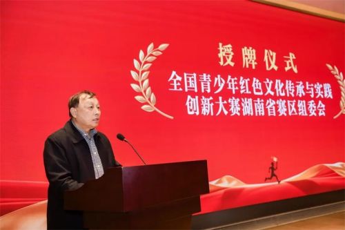 会议现场,中国红色文化研究会副会长、全国组委会主任胡呈军正式宣布全国青少年红色文化传承与实践创新大赛湖南省赛区组委会成立,并为湖南省赛区组委会授牌。胡呈军代表大赛全国组委会为启动会致辞,从全国视野解读大赛创办的时代背景与初心,强调赛事作为教育部白名单赛事的公益属性和育人价值,为湖南省赛区的赛事开展指明方向、擘画蓝图。