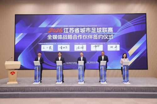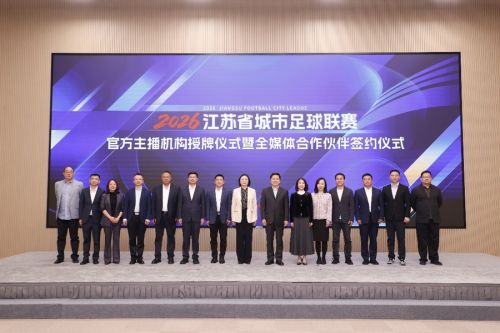 “苏超”新赛季开赛在即,江苏省广播电视总台作为唯一公用信号服务机构,将继续向全国各大媒体提供标准统一、制作精良的公用信号。活动现场,江苏省体育产业集团党委书记、董事长、江苏省体育总会副会长顾晔与江苏省广播电视总台党委委员、副台长、集团副总经理何可一完成2026江苏省城市足球联赛官方主播机构的授牌仪式。