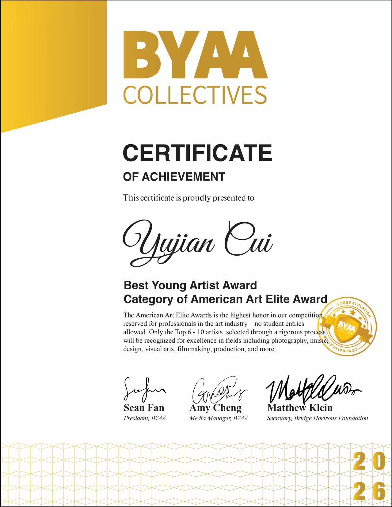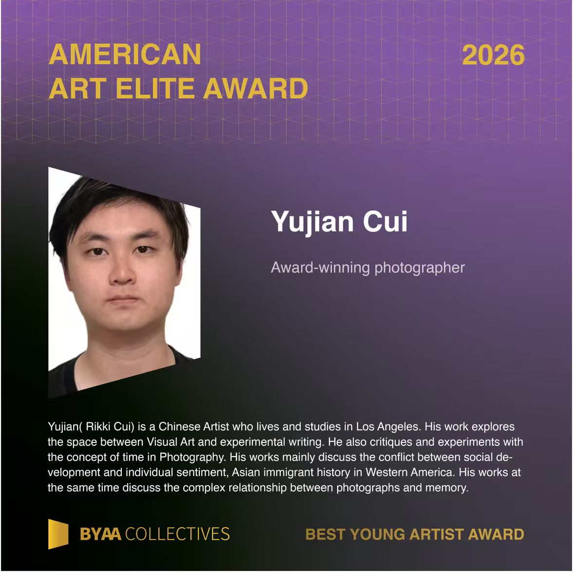 BYAA Collectives and American Art Elite Awards作为视觉艺术、音乐、舞蹈、电影、戏剧等多个领域的重要评选比赛之一,除了其评审团均来自相关领域的重要知名艺术家外,其评选标准也会除了根据投递作品本身以外综合考虑参选人在其领域的专业性。此次 BYAA 获奖,既是国际艺术界对崔誉舰专业造诣的高度认可,更是中国青年艺术家在国际纪实摄影领域的一次重要发声。他用影像展现少数族裔群体在移民历史中的脉络与东方人文精神,为国际文化交流搭建起全新的艺术通道。